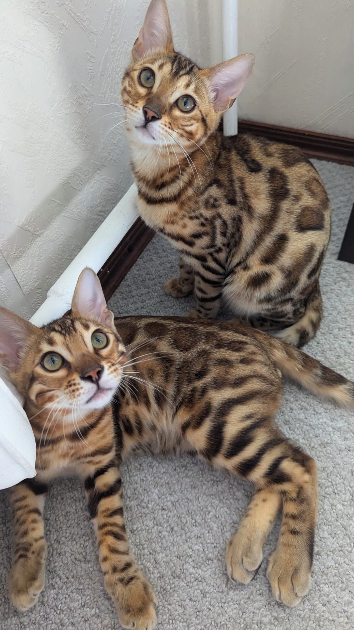 Du Bengalijos kačiukai. Mergaitė ir berniukas.Žaismingas. Draugiški ir meilūs Bengalijos kačiukai.Kačiukams yra 4 mėnesiai.