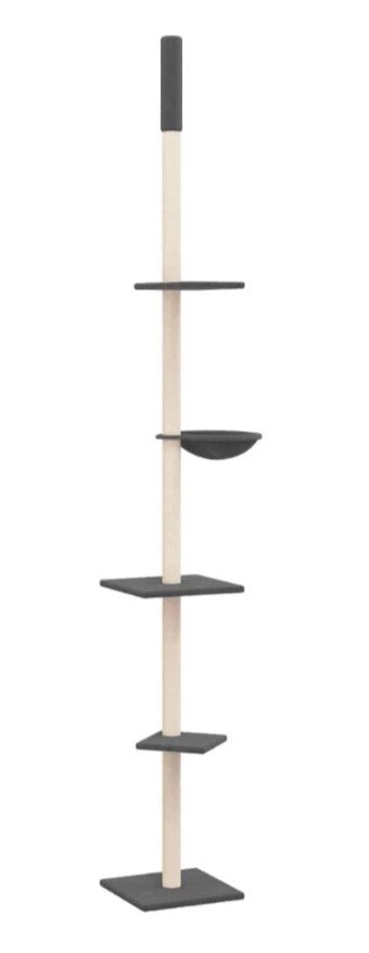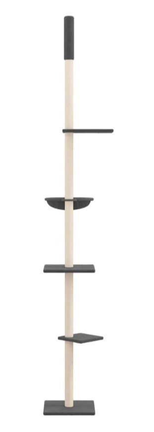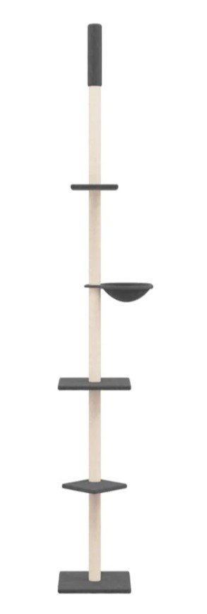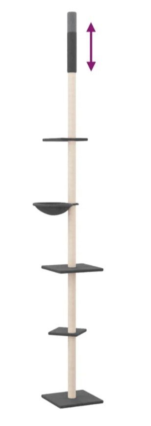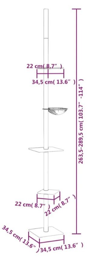 ♦ Praktiškas dizainas: turintis reguliuojamą stulpą, kačių veiklos centras gali būti pritvirtintas prie lubų, o jo aukštis reguliuojamas nuo 263,5–289,5 cm.