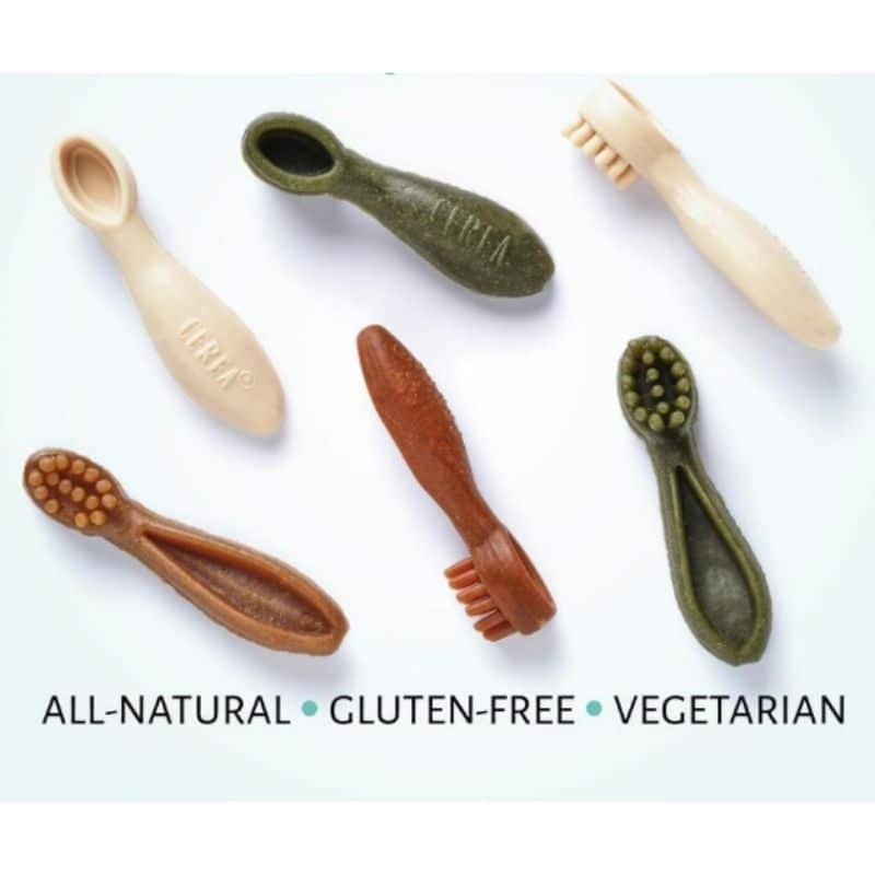 „Cerea Brush“ dantų kramtukai suteikia ne tik gaivų kvapą, bet ir padeda išlaikyti jūsų šunų dantis sveikus ir švarius. Glitimo neturintys, vegetariški ir natūralūs kramtukai idealiai tinka šunims. Sudėtis: Bulvių miltai, ryžių miltai, glicerinas, celiuliozės milteliai, tapijokos krakmolas, džiovintos alaus mielės. Analitinės sudedamosios dalys: žalių baltymų 6.5%, žalių riebalų 1.5%, žalios ląstelienos 1.5%, žalių pelenų 3.5%, drėgnio 14%.