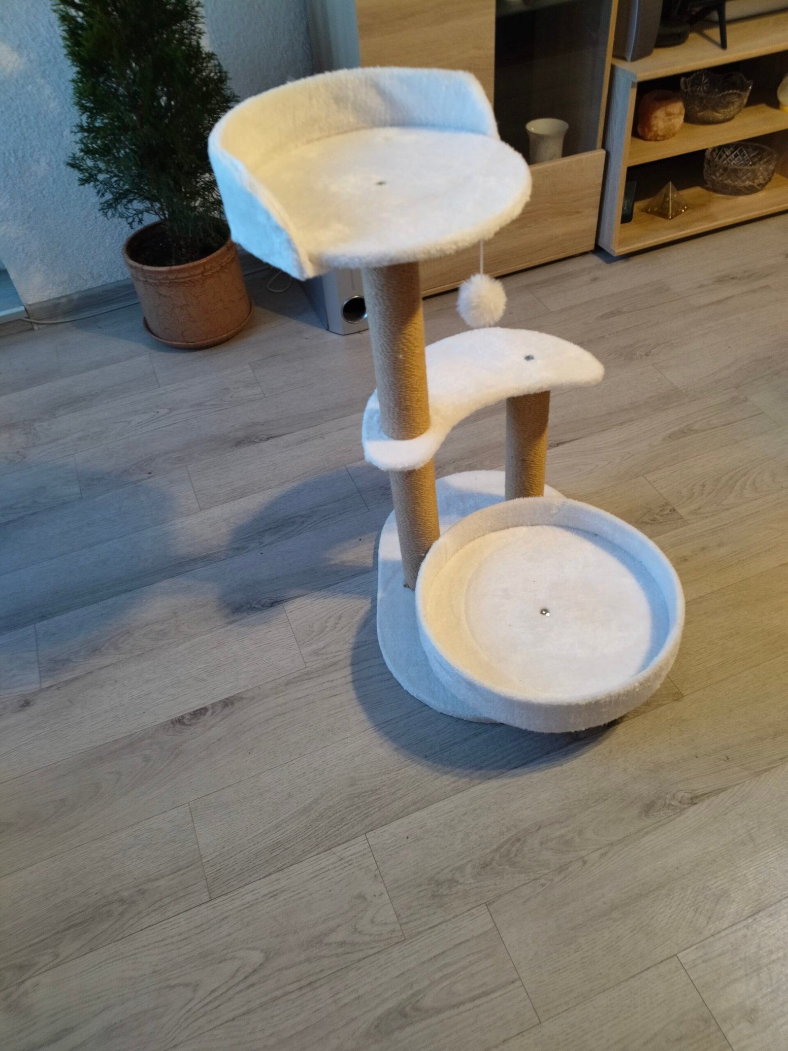 Visiškai nauja laipynė-draskyklė. Trijų aukštų, balta. Draskyklė iš sizalio virvės, gultai is balto minkšto ,pūkuoto audinio. Neapsiverčianti.