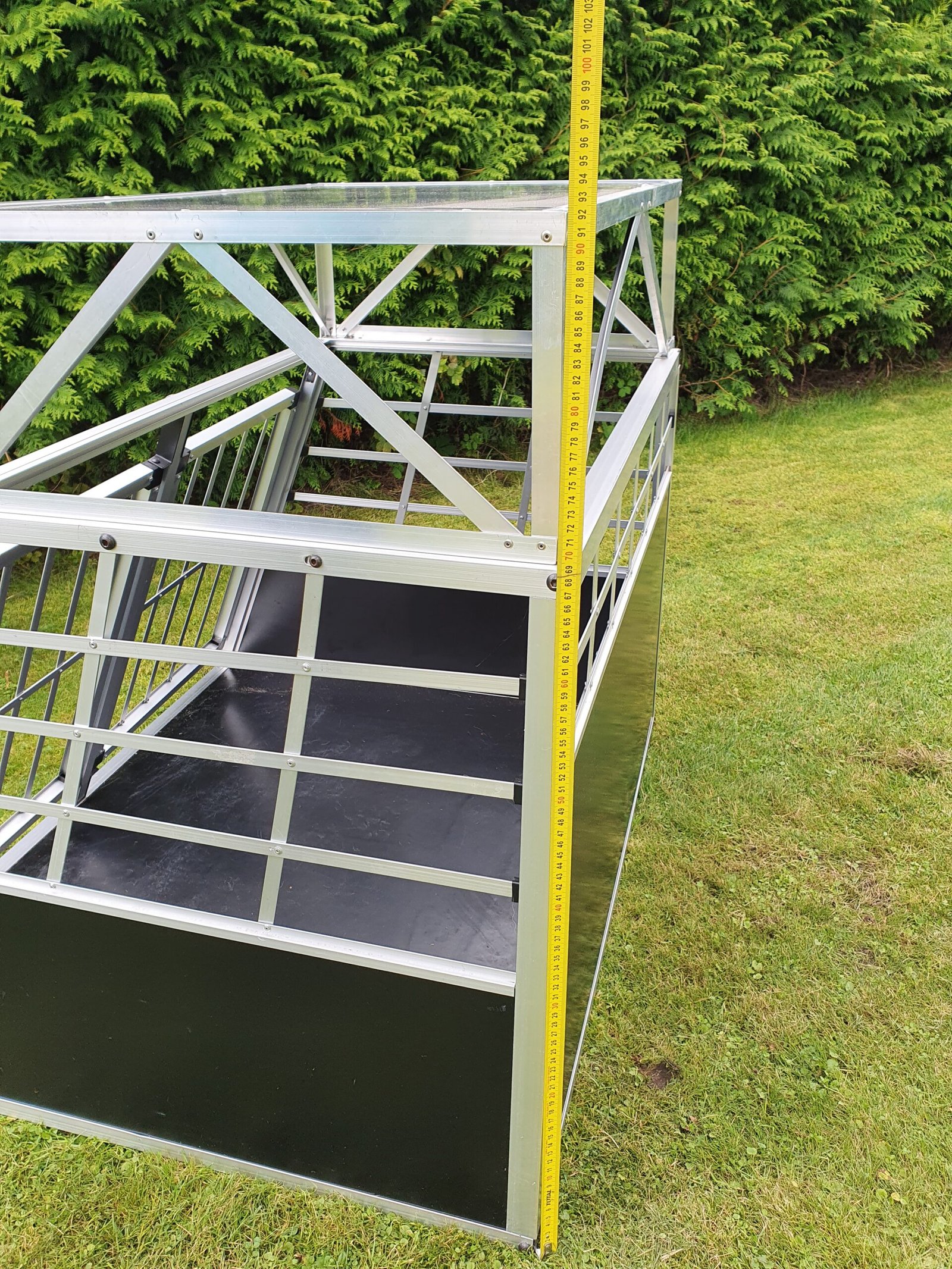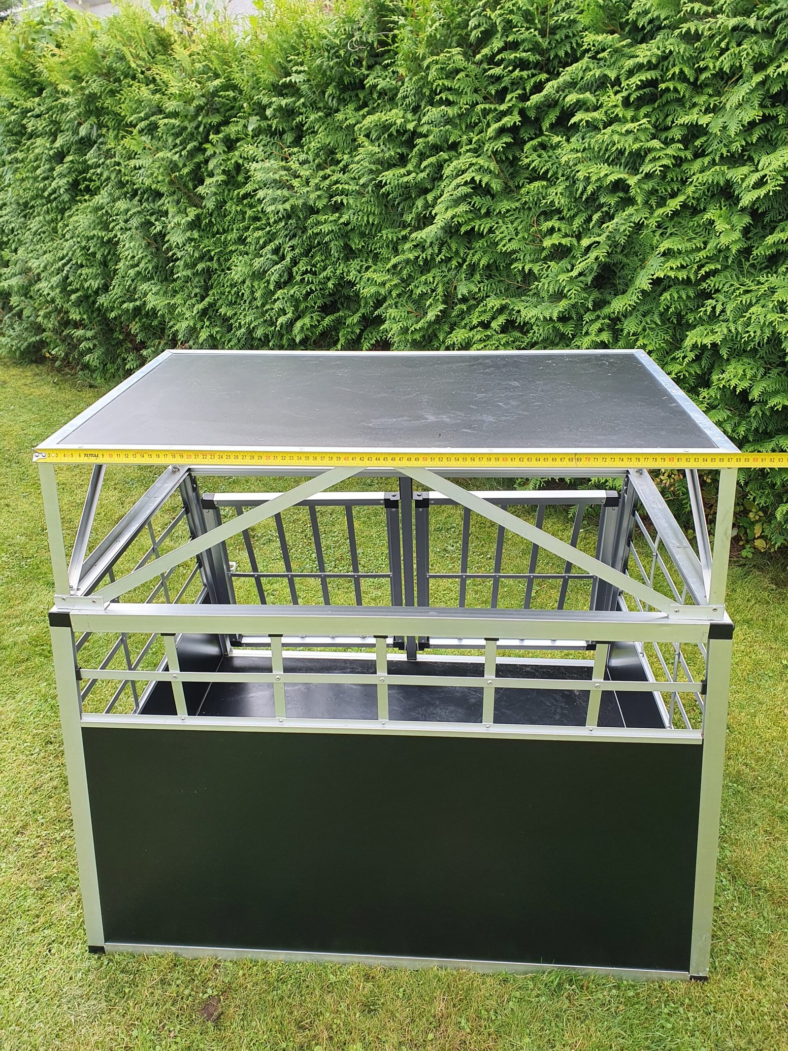 Lengvas aliumininis, bet tvirtas vokiškas transportavimo narvas, tinkamas dideliems šunims pervežti, arba laikyti. Viršutinę dalį galima nuimti, sumažinant narvo aukštį. Mažai naudotas. Išmatavimai nuotraukose.