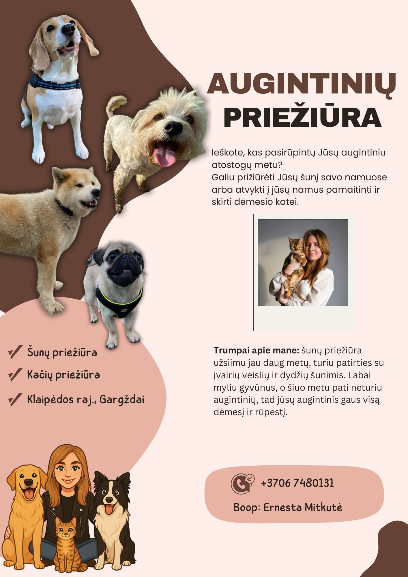 Trumpai apie mane: augintinių priežiūra užsiimu jau daugelį metų, turiu patirties su įvairių veislių ir dydžių augintiniais. Esu atsakinga, aktyvi, labai myliu gyvūnus ir visada stengiuosi, kad jie jaustųsi saugiai bei jaukiai.