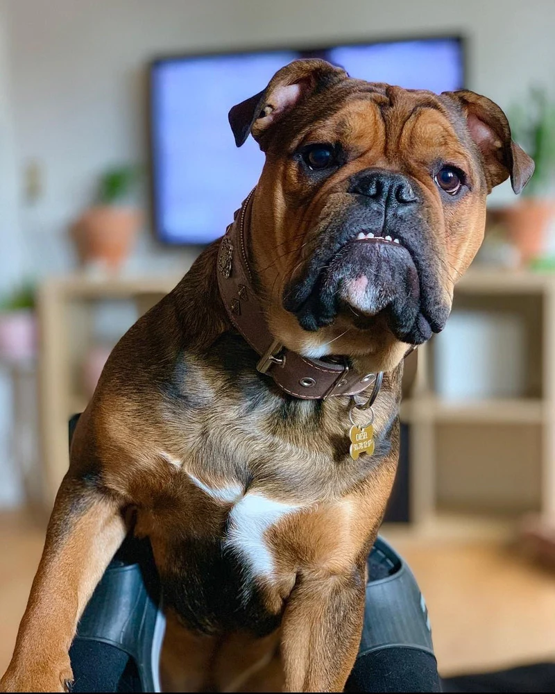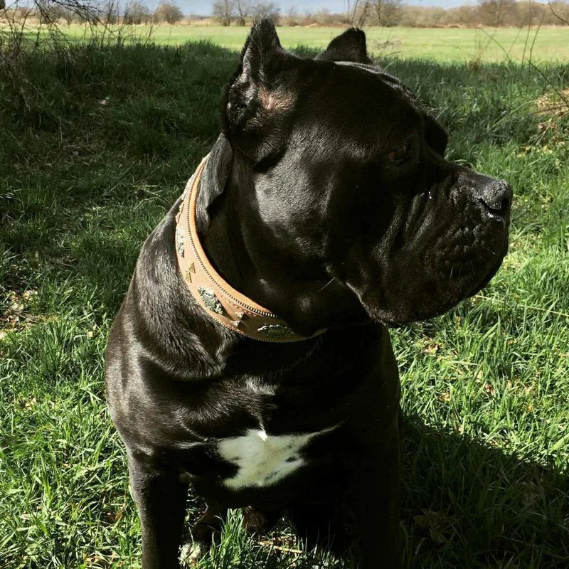 Rankų darbo komplektas iš natūralios itališkos odos, sukurtas dideliems, stipriems šunims. Dekoruotas masyviomis metalinėmis kniedėmis ir žalvario atspalvio piramidėmis – drąsus ir išraiškingas pasirinkimas. Minkštas paminkštinimas užtikrina patogumą, o nikelio detalės suteikia ilgaamžiškumo. Tai ne tik aksesuaras, bet ir stiliaus simbolis, išryškinantis jūsų šuns jėgą bei charakterį.