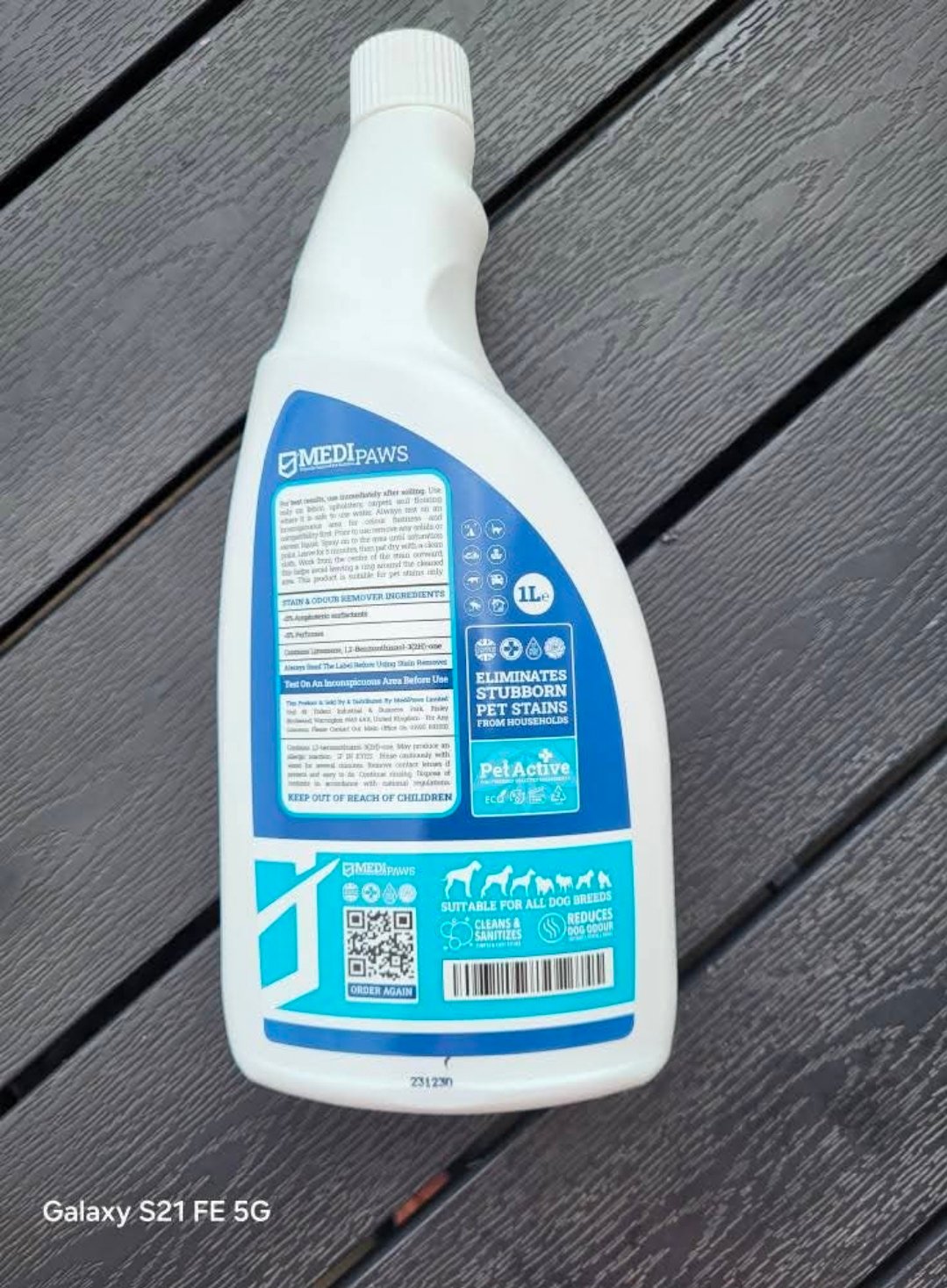 „MediPaws Stain & Odour Remover“ – dėmių ir kvapų šaliniklis su citrinų kvapu, skirtas naminiams gyvūnams.