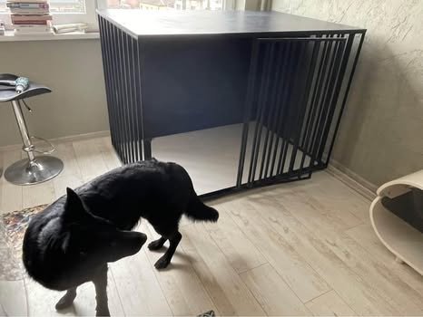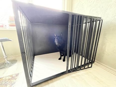 Metalinis narvas. Grindys, lubos ir galine sienelė iš baldinės plokštes. Išmatavimai 1.5m ilgis, 1.0m plotis, 1.05m aukštis. Nuotraukoje vokečių aviganis